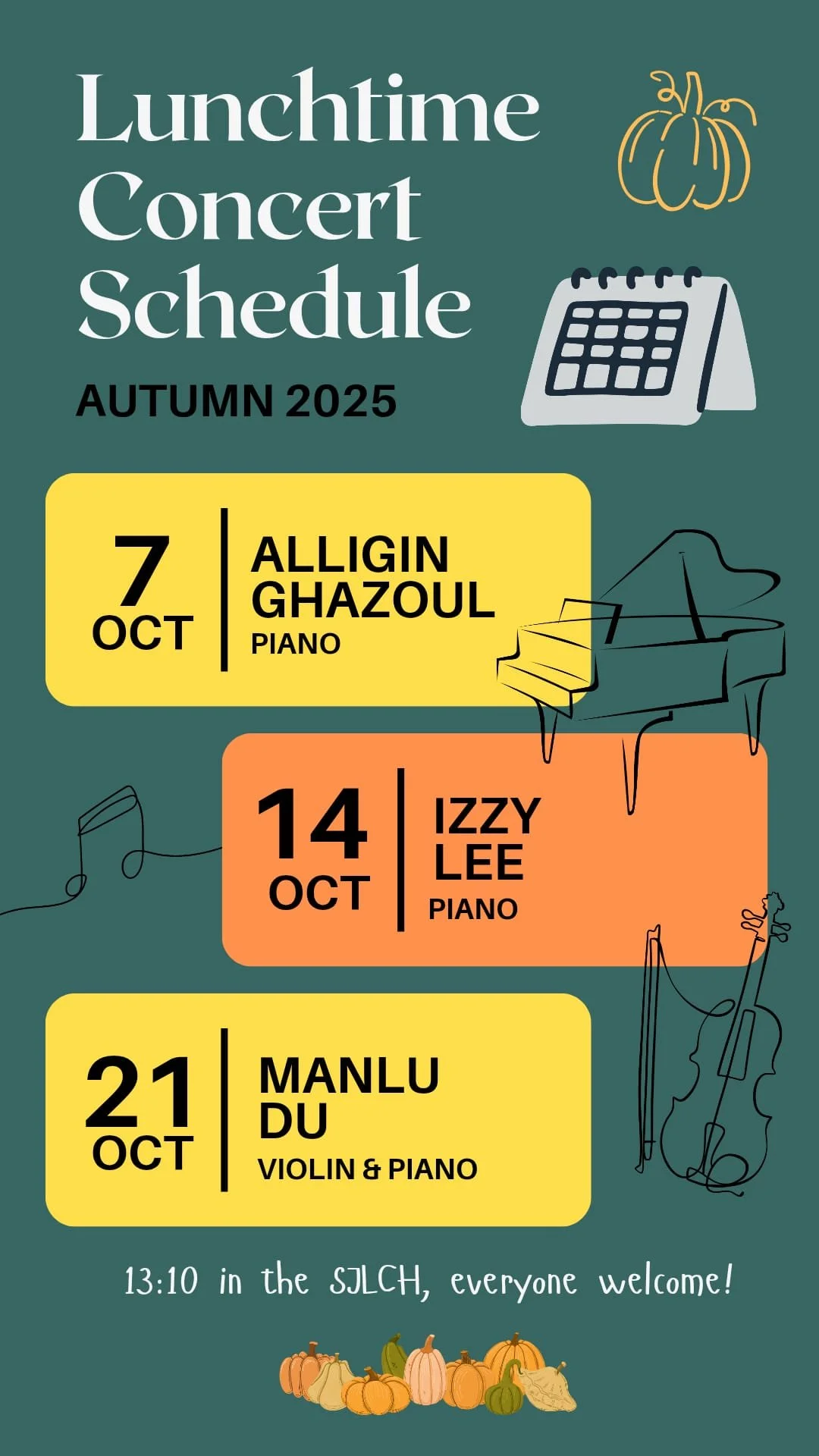 During term time, we host a weekly concert in the Sir Jack Lyons Concert Hall. This happes every Tuesday at 1.10pm, and they’re free to attend.